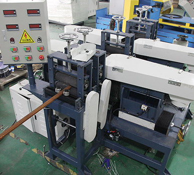 扁铁两侧抛光机由前后四个磨头组成,打磨耗材为砂带,可对扁铁、扁条的左右两侧自动进行去毛刺、除锈、打